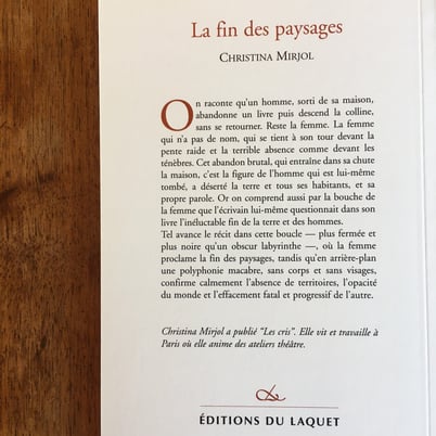 "Le questionnement grave de Christina Mirjol devant l’inéluctable fin des paysages, construit un récit en boucle fermée, un labyrinthe sans issue sur une toile de fond déchirée