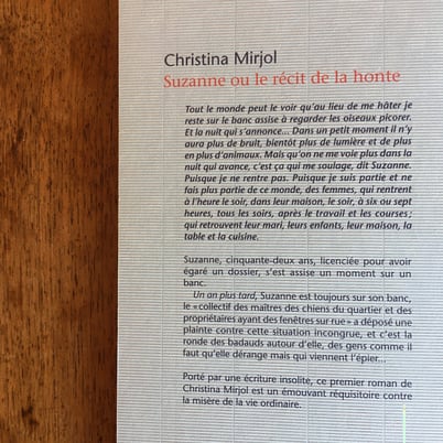 "Christina Mirjol est l'auteur d'une série de cris ... Avec Suzanne ou le récit de la honte, le cri se prolonge, ce qui oblige l'auteur à aller fouailler un peu plus loin dans les ténèbres de la nature humaine."